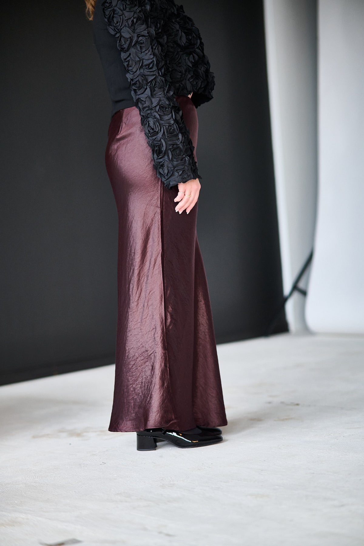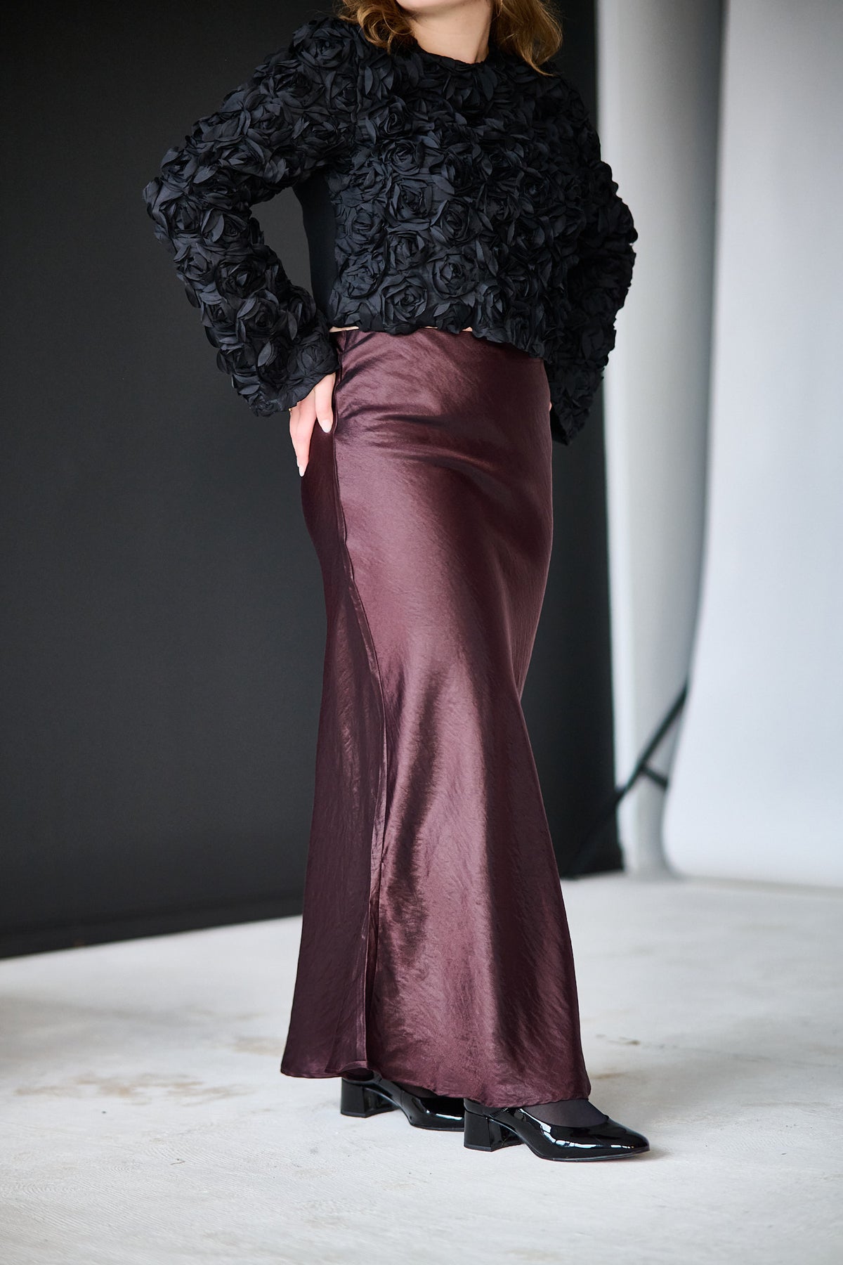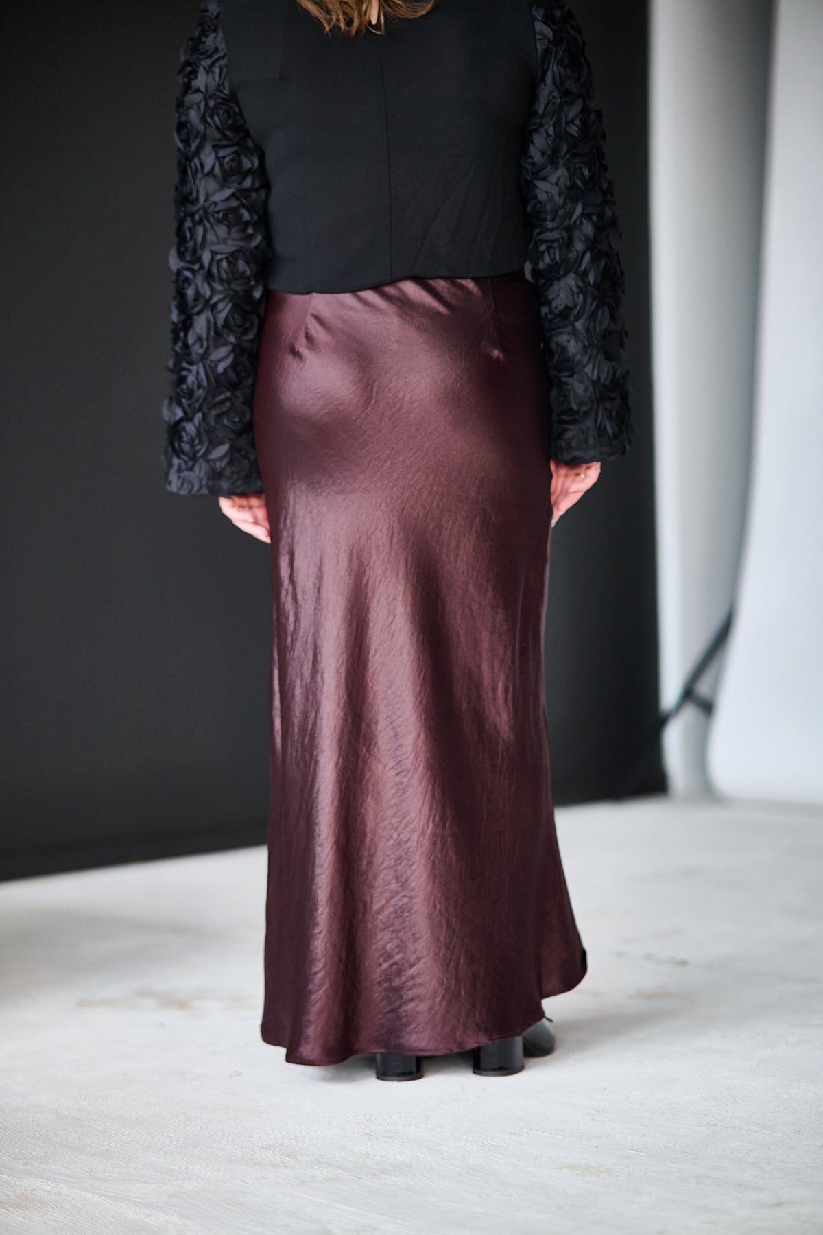 Levete Room Nessa 4 er et elegant skjørt laget av 67 % LENZING™ ECOVERO™ viscose, 19 % polyamid og 14 % polyester. Skjørtet har en glatt tekstur med et subtilt vevmønster og en ren, ankellang finish. Det gir et sofistikert og feminint uttrykk som passer til både hverdag og fest.
