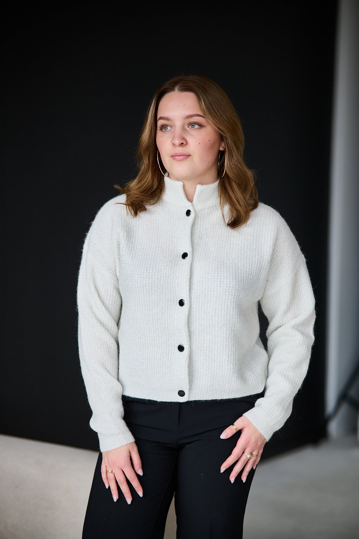 Gestuz Alpha Shimmer Cardigan – Ivory with Lurex er den perfekte cardiganen for deg som ønsker en tidløs og anvendelig favoritt – elegant, komfortabel og stilren. Den myke ull- og alpakka-blandingen gir en luksuriøs følelse, mens den subtile lurex-tråden tilfører et diskret, glitrende preg. Den avslappede passformen og den høye halsen gir et sofistikert uttrykk, mens de svarte knappene og den lette strukturen tilfører et moderne touch. En allsidig cardigan som kan styles med alt fra jeans og skjørt til over en kjole – et plagg du vil bruke igjen og igjen.