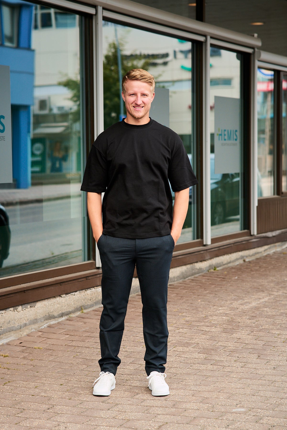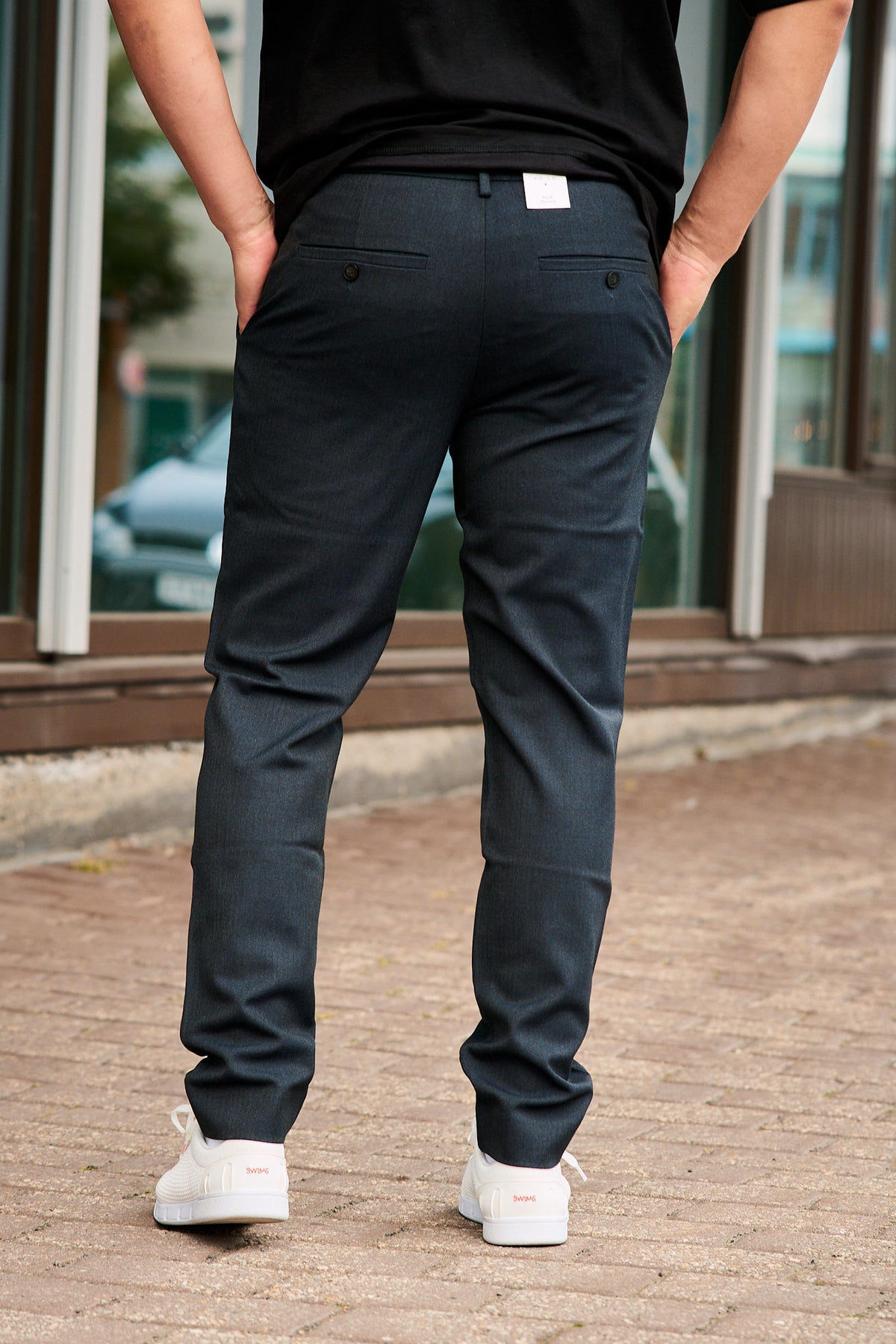 JoshPL 056 er slim-fit bukse. Komplett med to skrå frontlommer, to paspolerte baklommer, belteløkker, skjult kroklukking og glidelås. En trekantdetalj på frontlommene understreker deres livlige, men varige stil.