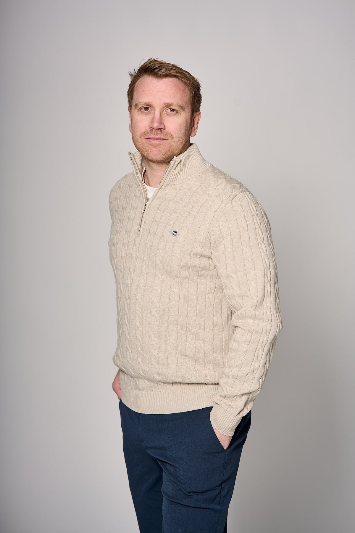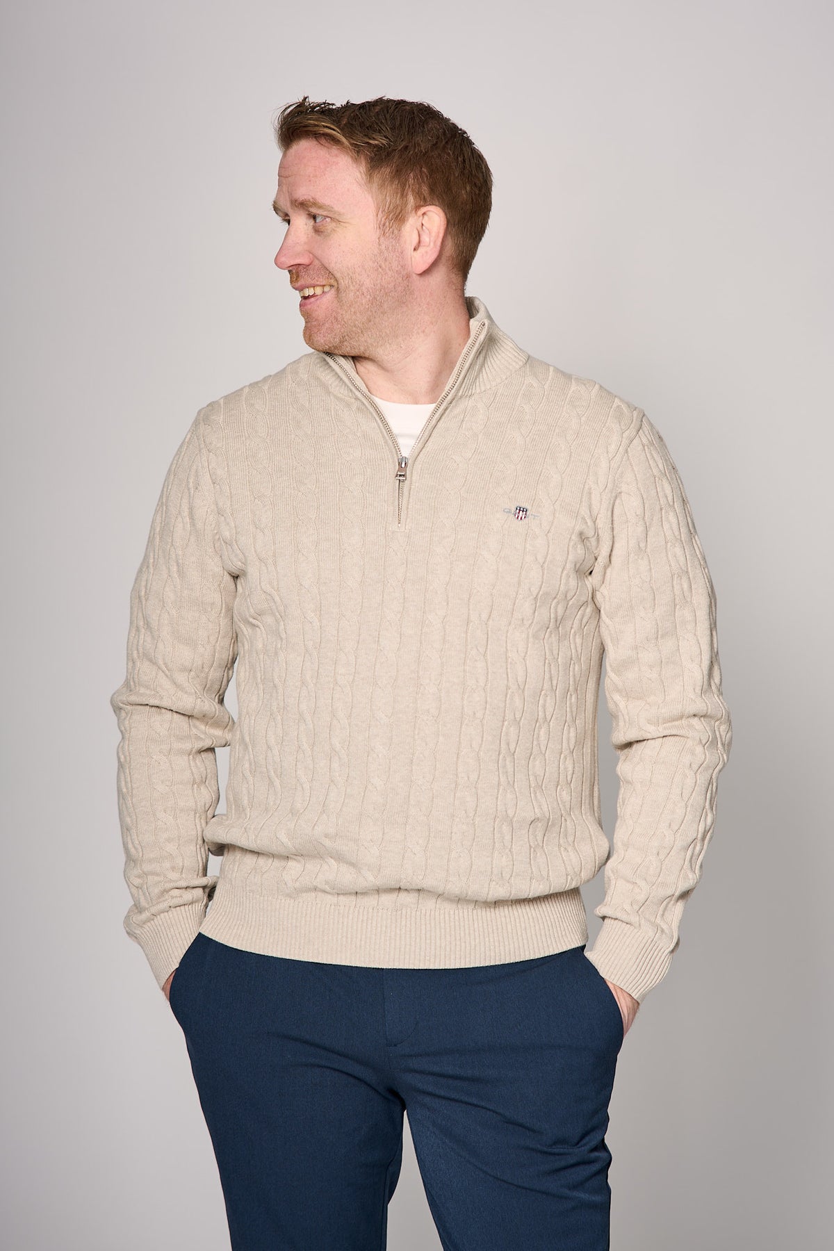 Gant Cotton Cable Half Zip er en klassisk og komfortabel genser laget i myk bomull med kabelstrikk som gir tekstur og et tidløst uttrykk. Half zip-designet tilfører et moderne preg og gjør det enkelt å justere stilen – lukket for et klassisk uttrykk eller halvåpen for en mer avslappet look.