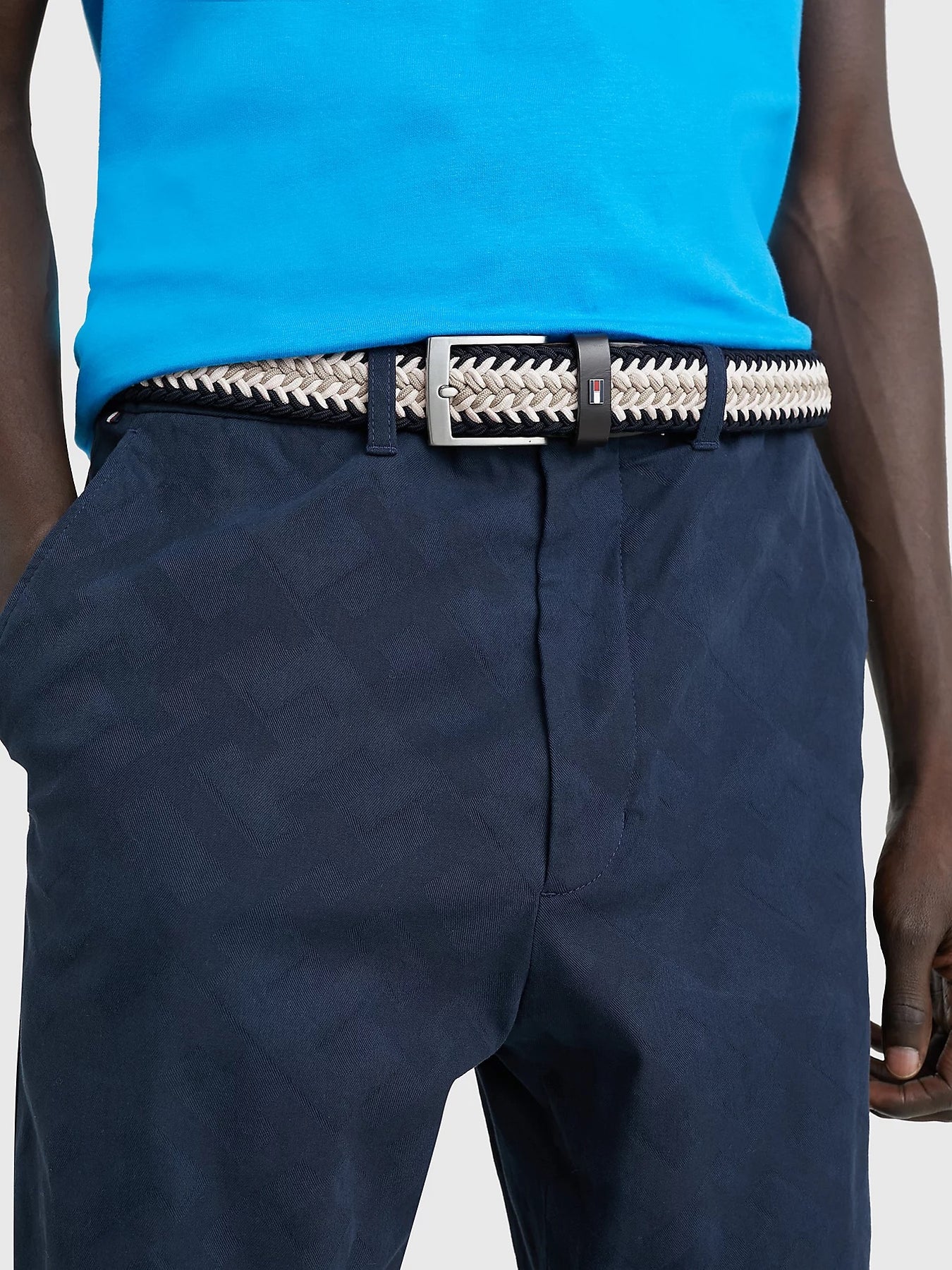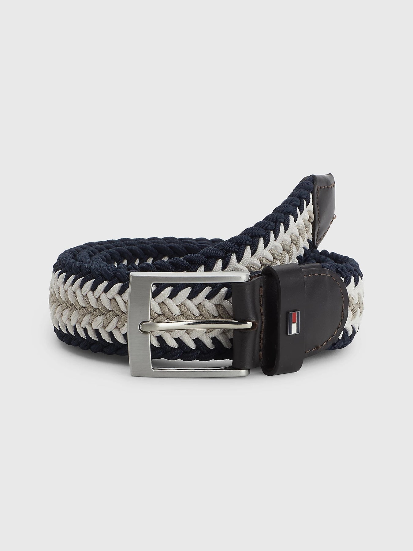 Dette beltets intrikate flettede design er laget av elastisk webbingstoff for komfort og tekstur, mens emaljeflagget legger til subtil merkevarebygging.