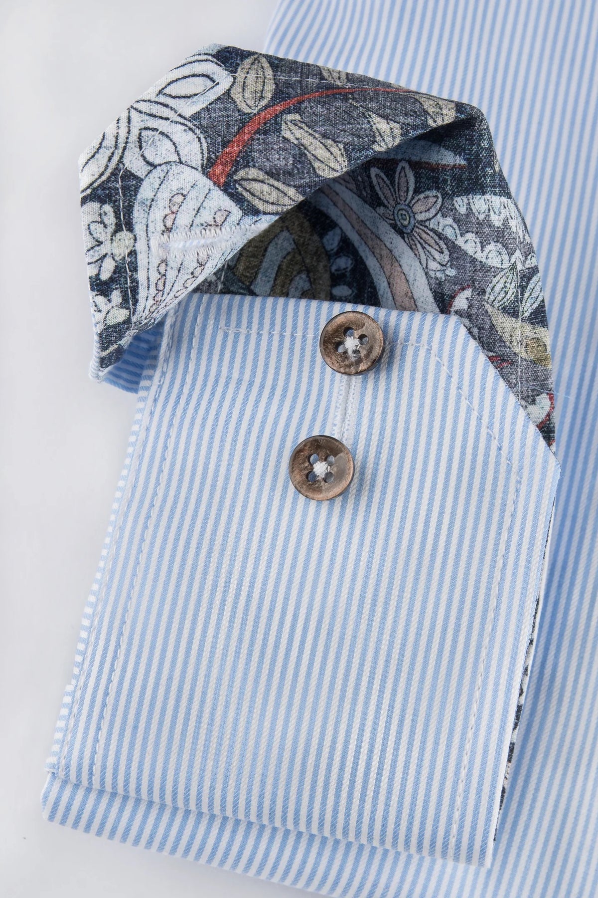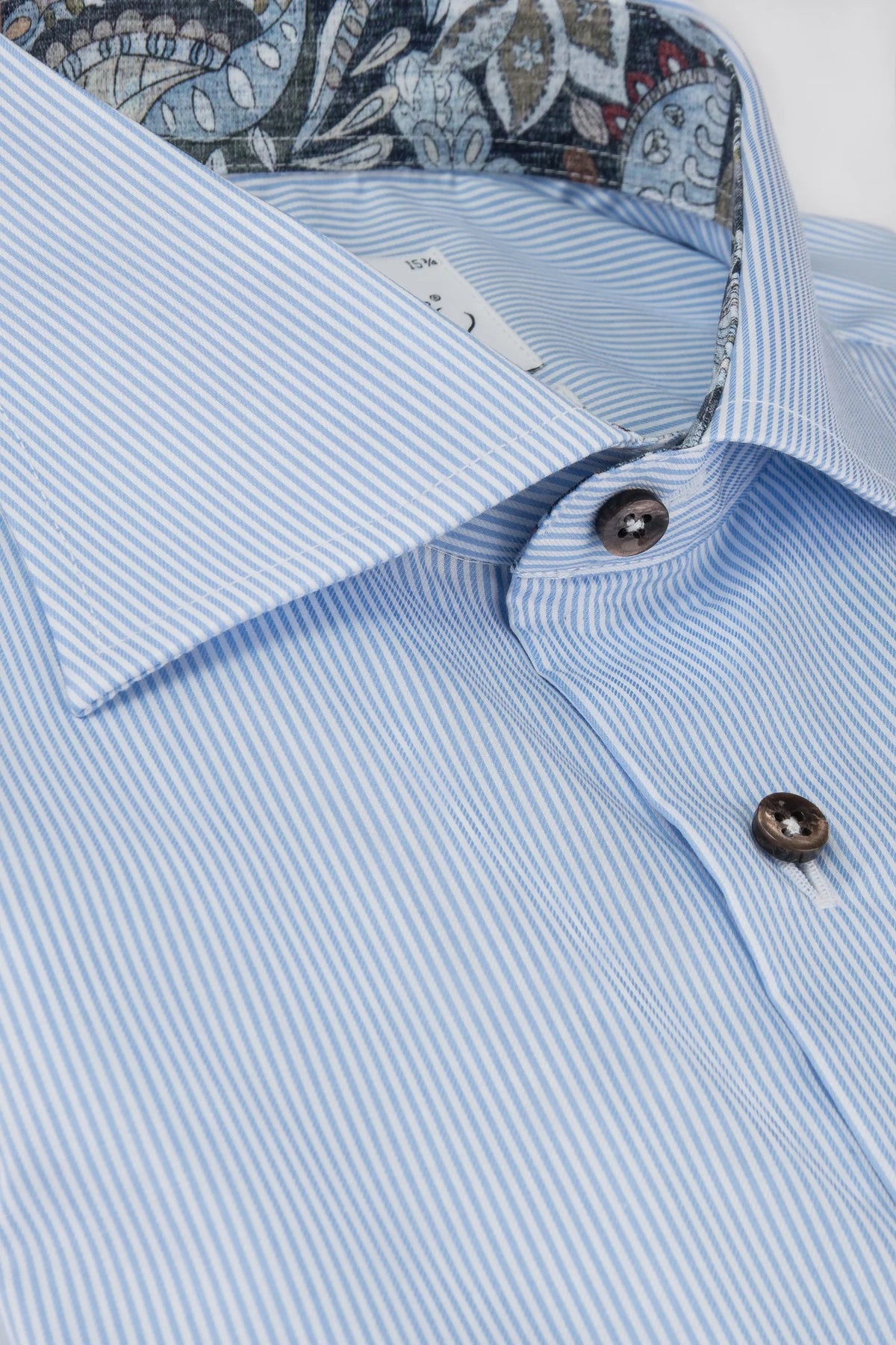 Stripete skjorte fra Oscar of Sweden. Skjorten har kontrastfarge i kragen og mansjettene. Brune knapper og brystlomme. 100% bomull. Regular passform