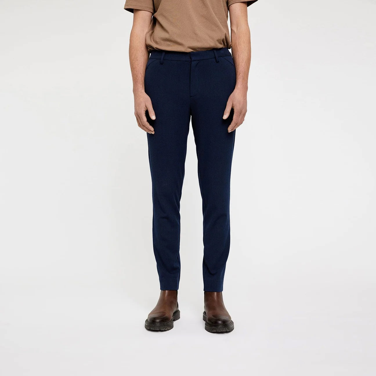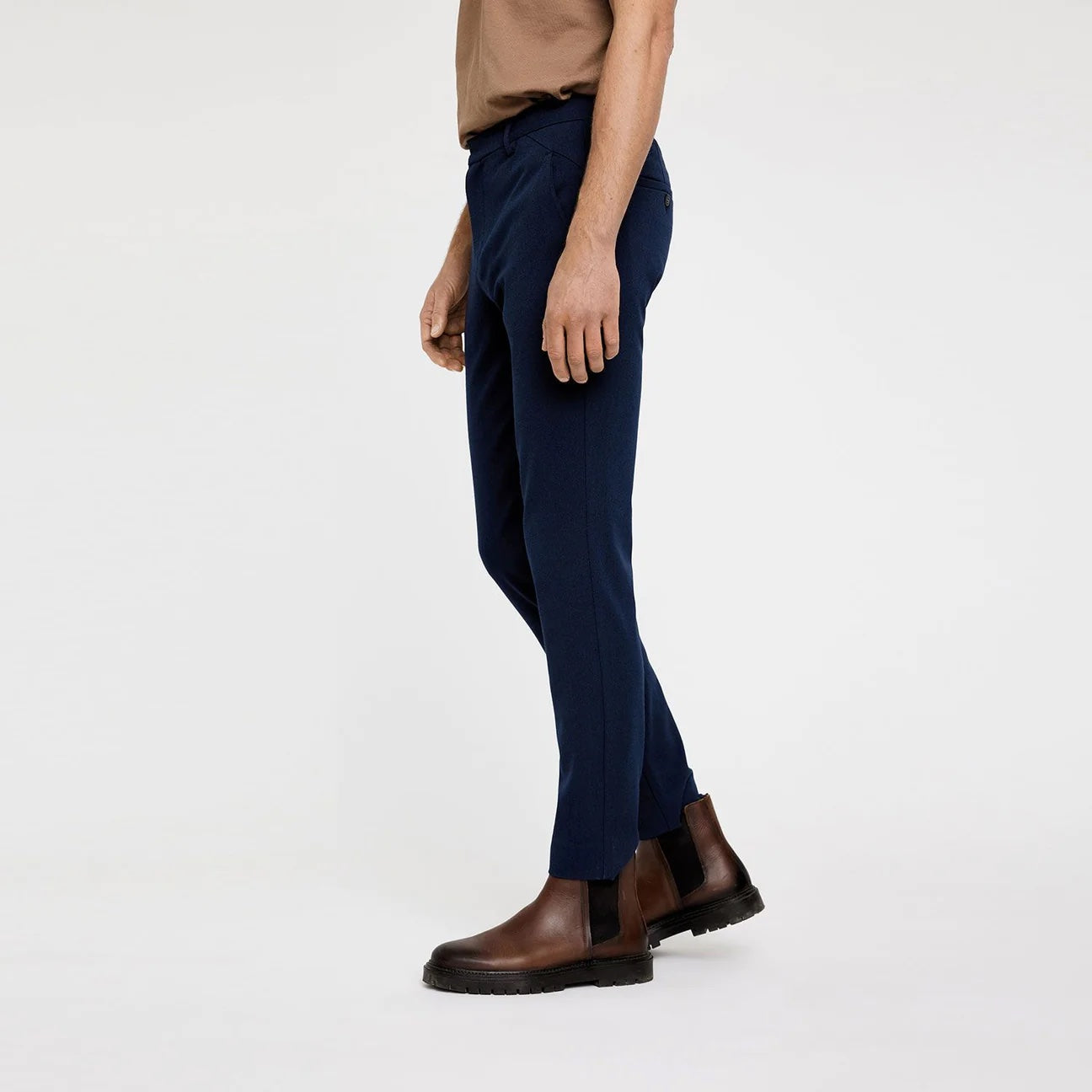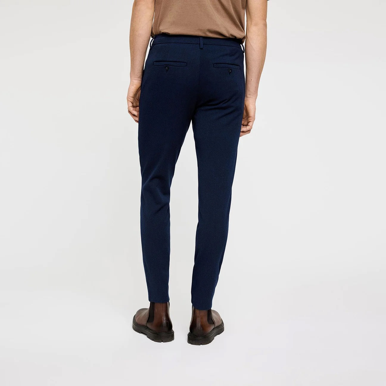 'Josh' er klassiske bukser med smal passform du kan ha på deg hele dagen, komfortabelt – på din egen måte. Disse er laget av mykt lys-marine-melert twill-vevd stoff i en klassisk design. Komplett med to skrå frontlommer, to paspolerte baklommer, belteløkker, skjult kroklukking og glidelås. En trekantdetalj på frontlommene understreker deres livlige, men varige stil.