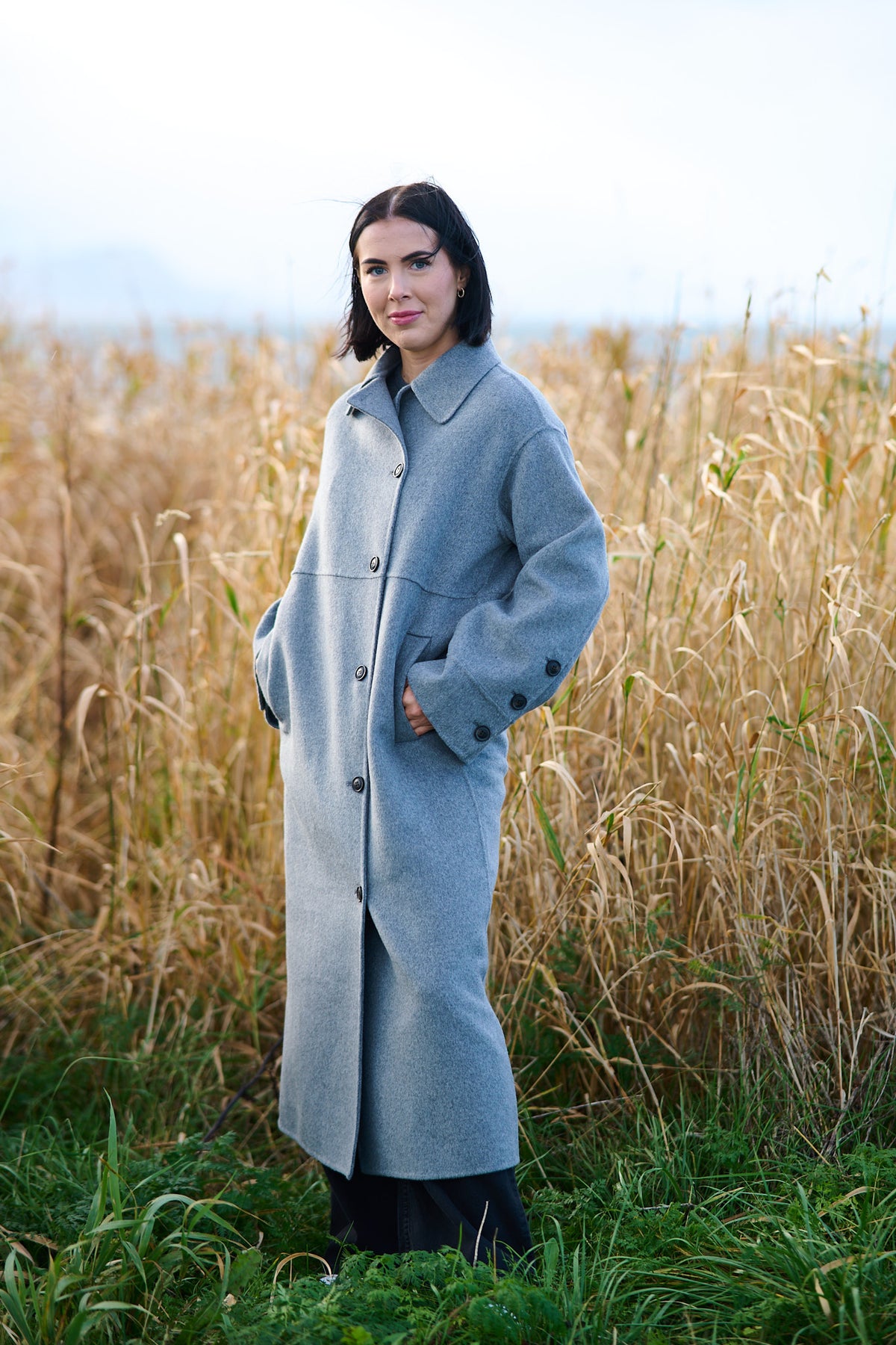 Levete Room Owa 24 Coat i fargen grå er en elegant og tidløs frakk som kombinerer moderne bærekraft med klassisk design. Denne lange kåpen er laget hovedsakelig av resirkulert ull, noe som gjør den til et miljøvennlig valg uten at det går på bekostning av stil eller kvalitet.