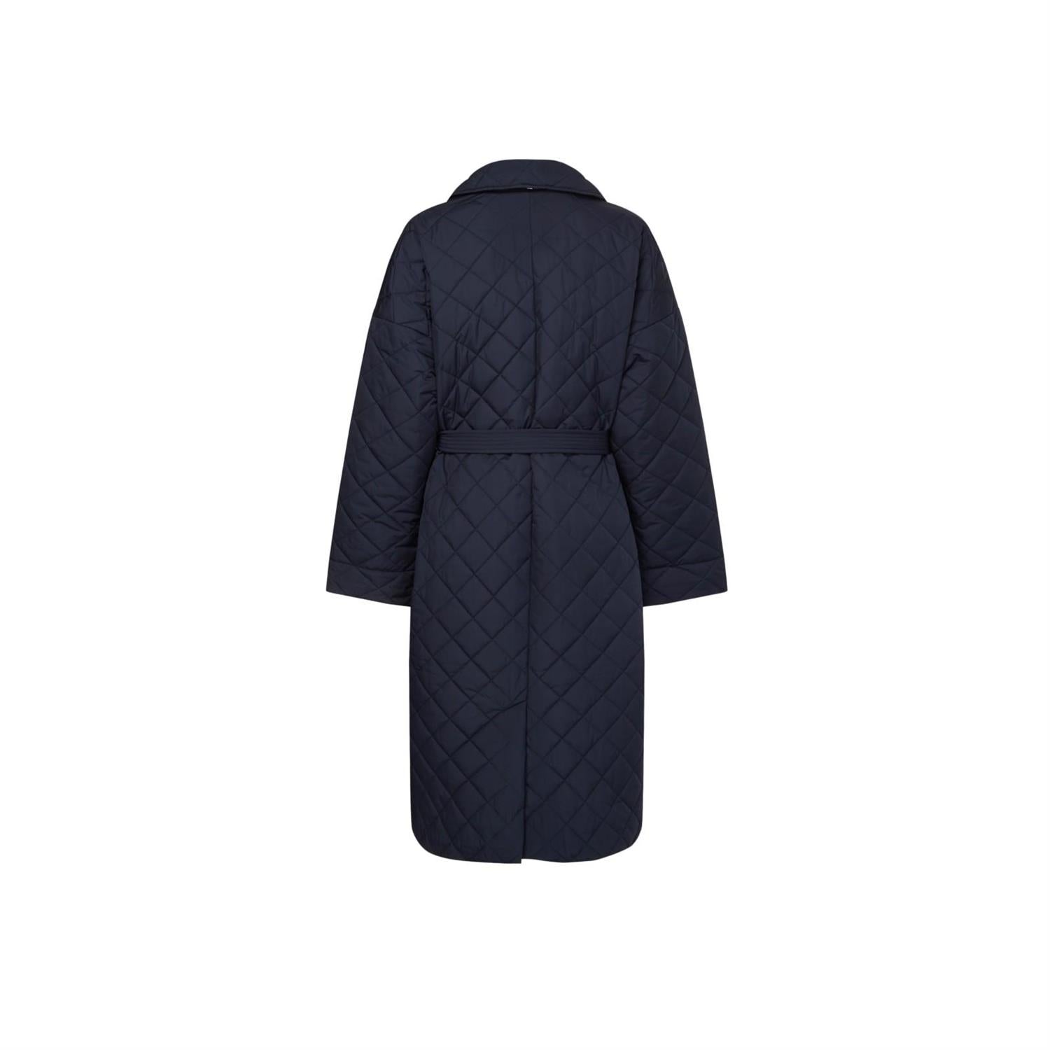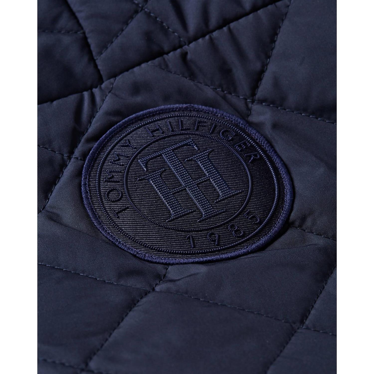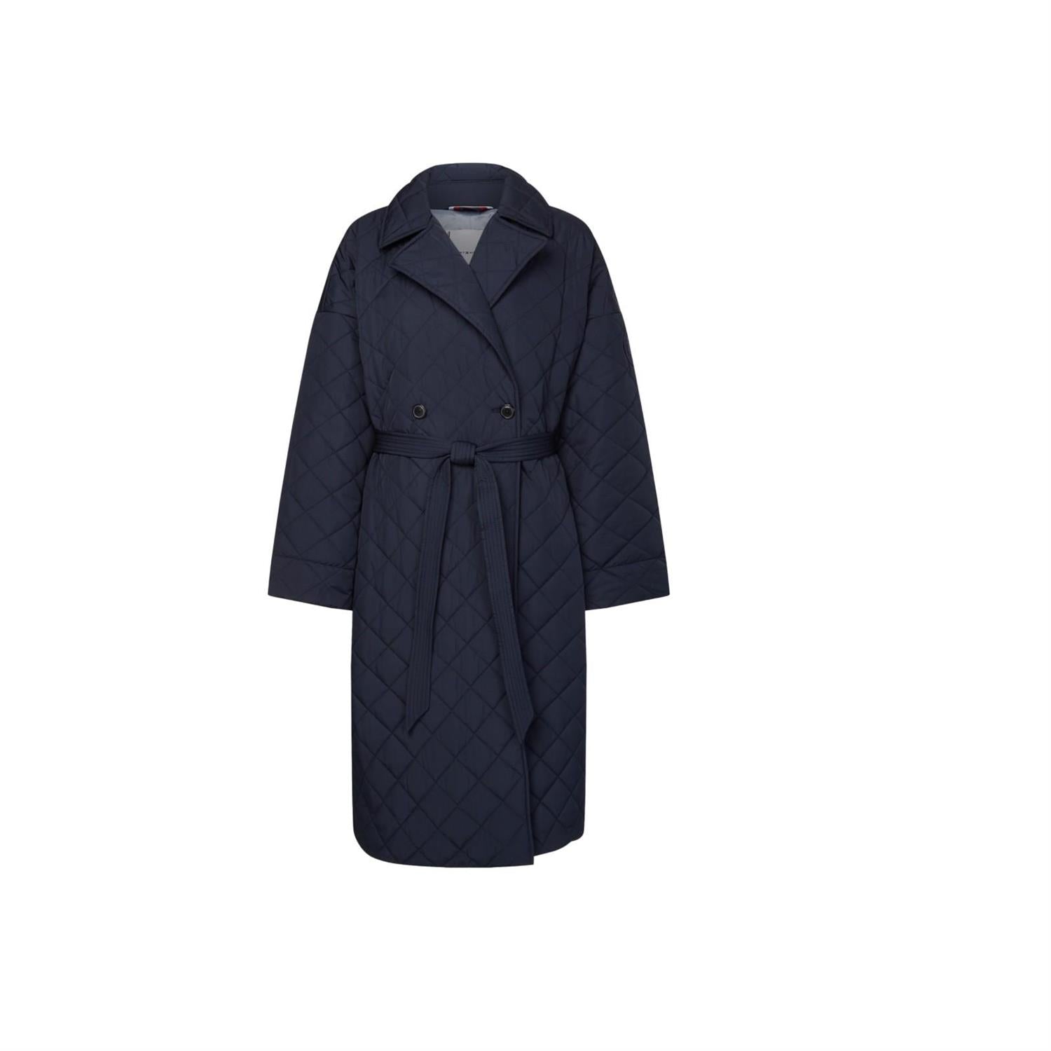 Tommy Hilfiger vattert jakke med vattert overflate. knappelukking og et dekorativt belte i midjen. En rett modell som kommer ned til omtrent under kneet.