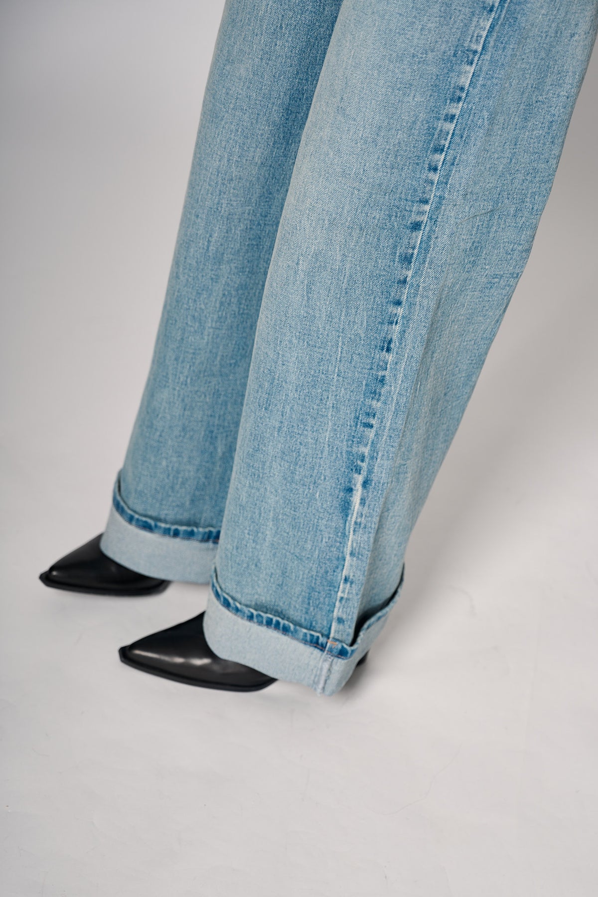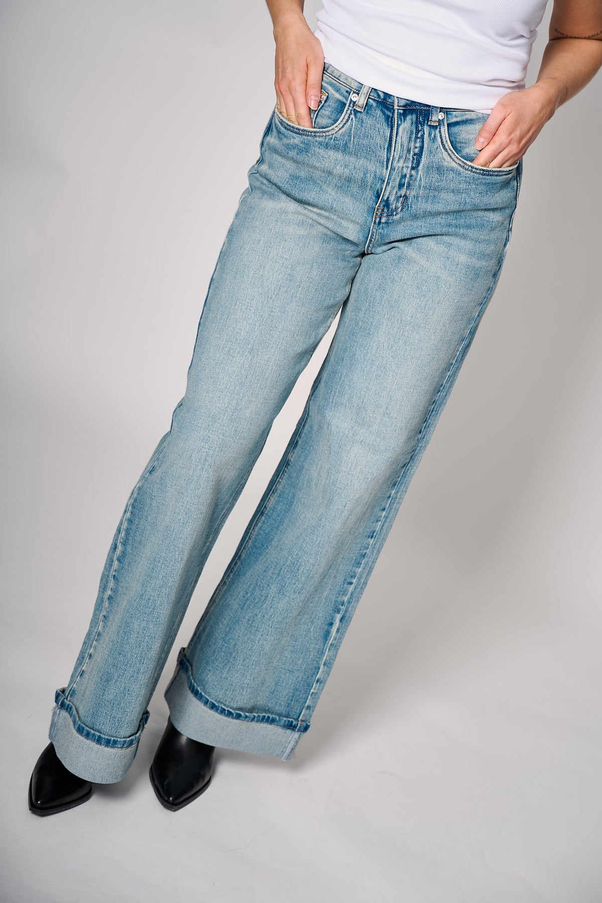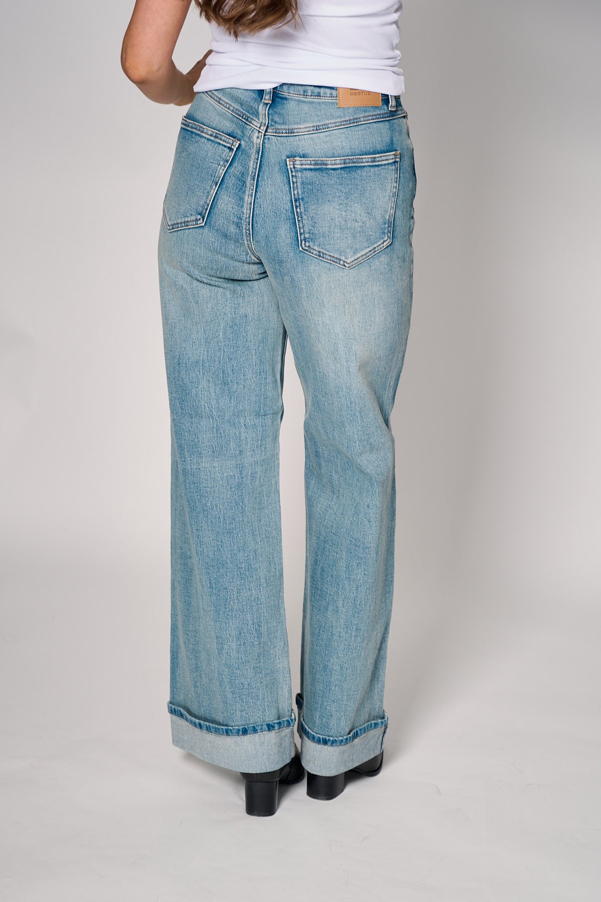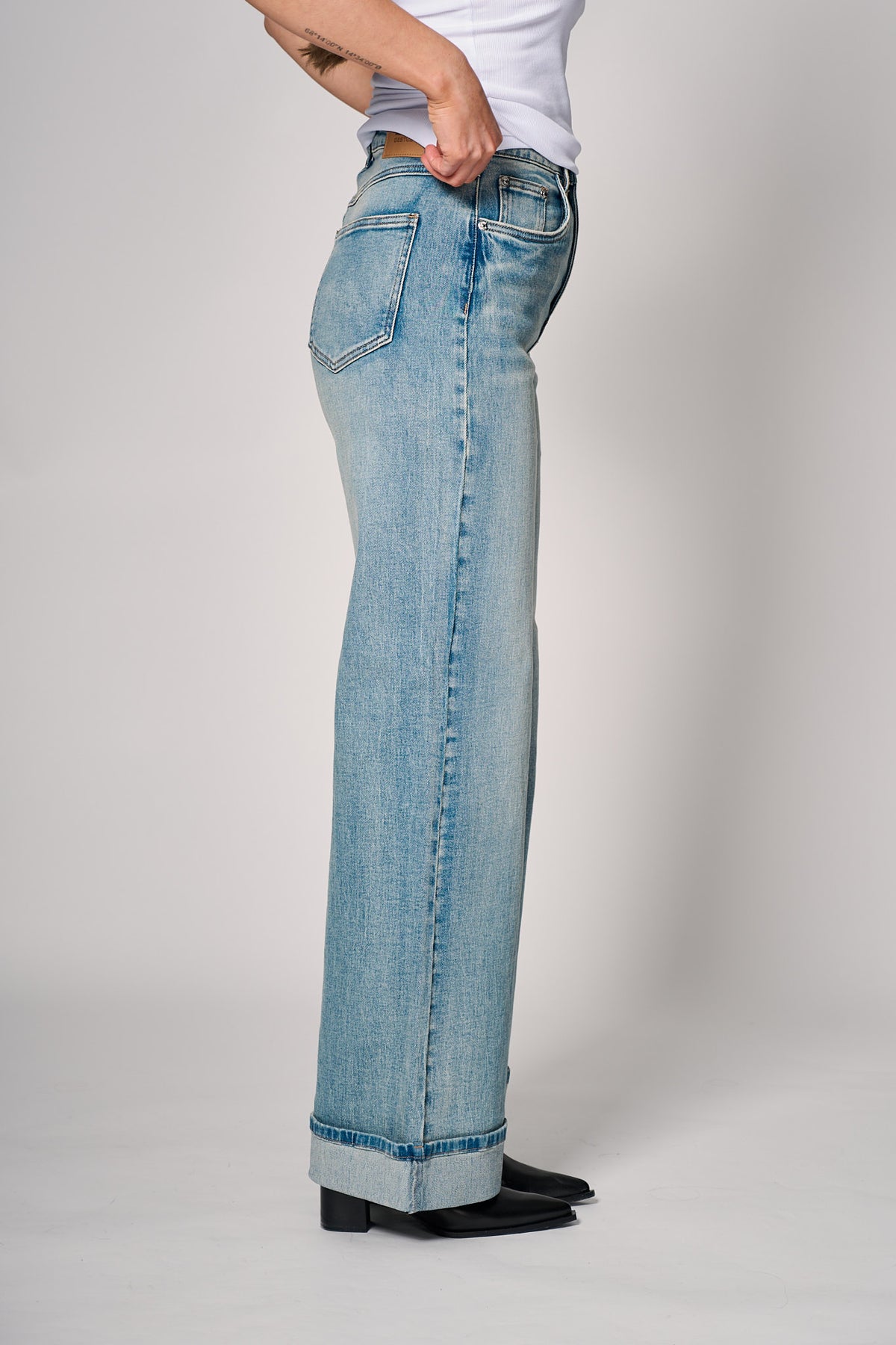 Klassiske wide-jeans med høy midje og avslappet silhuett i mellomblå denim – perfekt for både hverdagslook og mer kledelige antrekk. Myk denim med subtil stretch gir komfort gjennom hele dagen.