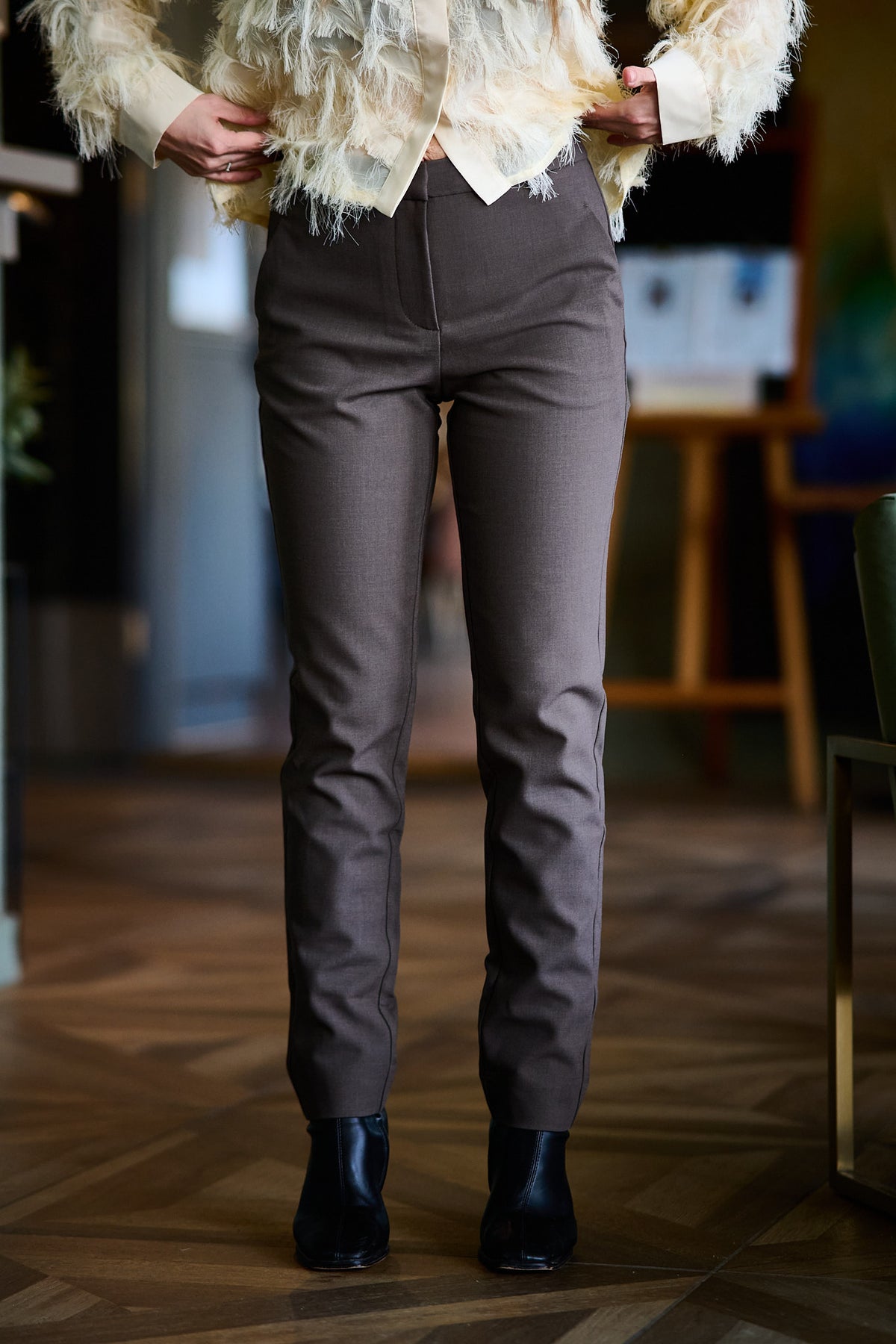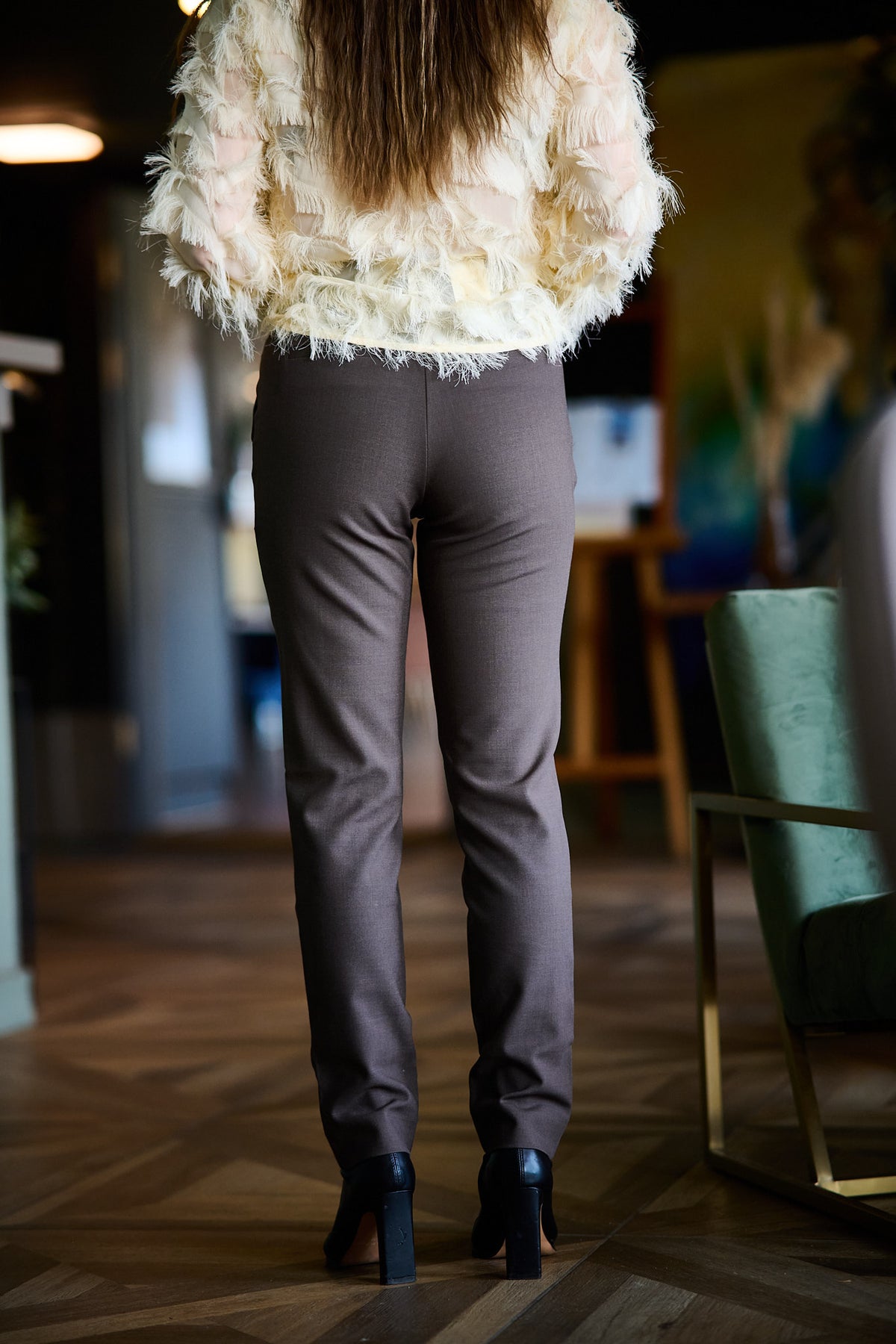 Five Units Kylie FV 826 – Mud Brown Ankle er de perfekte bukser for deg som ønsker en stilren, komfortabel og tidløs passform – moderne, perfekt for hverdagen og kontoret. Buksen har en ankel-lengde, midje som hviler på hoftebenet og slank, rett ben som gir et lengre uttrykk. Fargen «Mud Brown Melange» gir et varmt og jordnært preg som passer til både lyse og mørke overdeler. Buksen kombinerer komfort og eleganse — bruk den med sneakers og oversized skjorte for en avslappet look, eller med pumps og blazer for et dresset uttrykk.