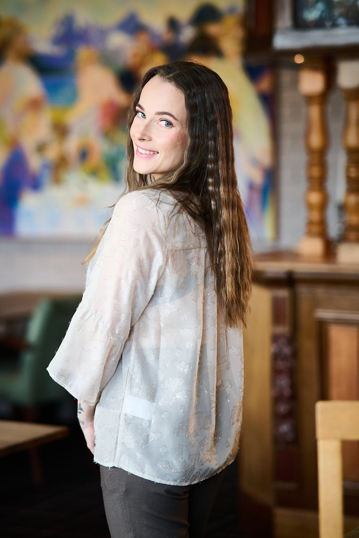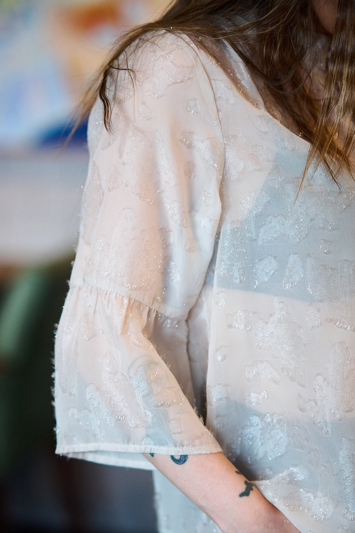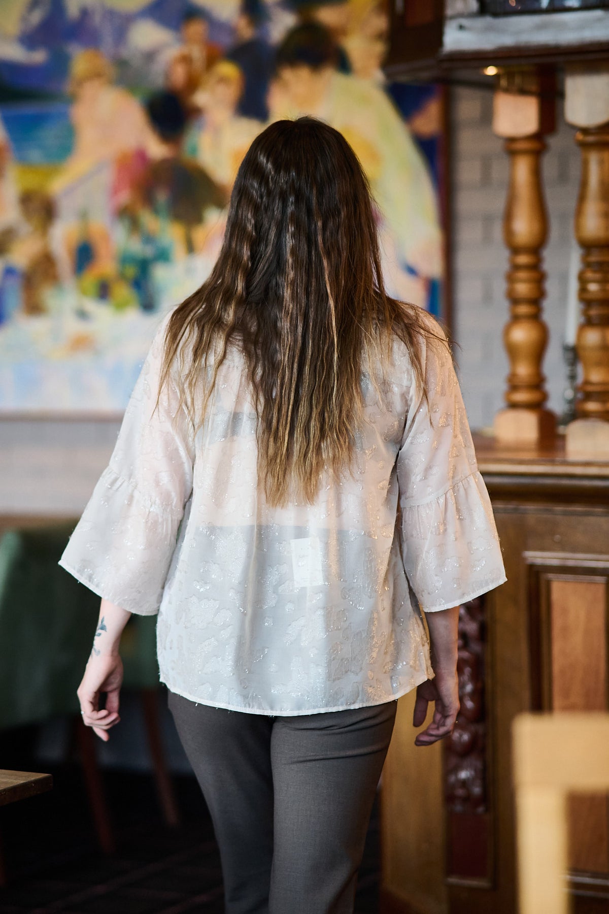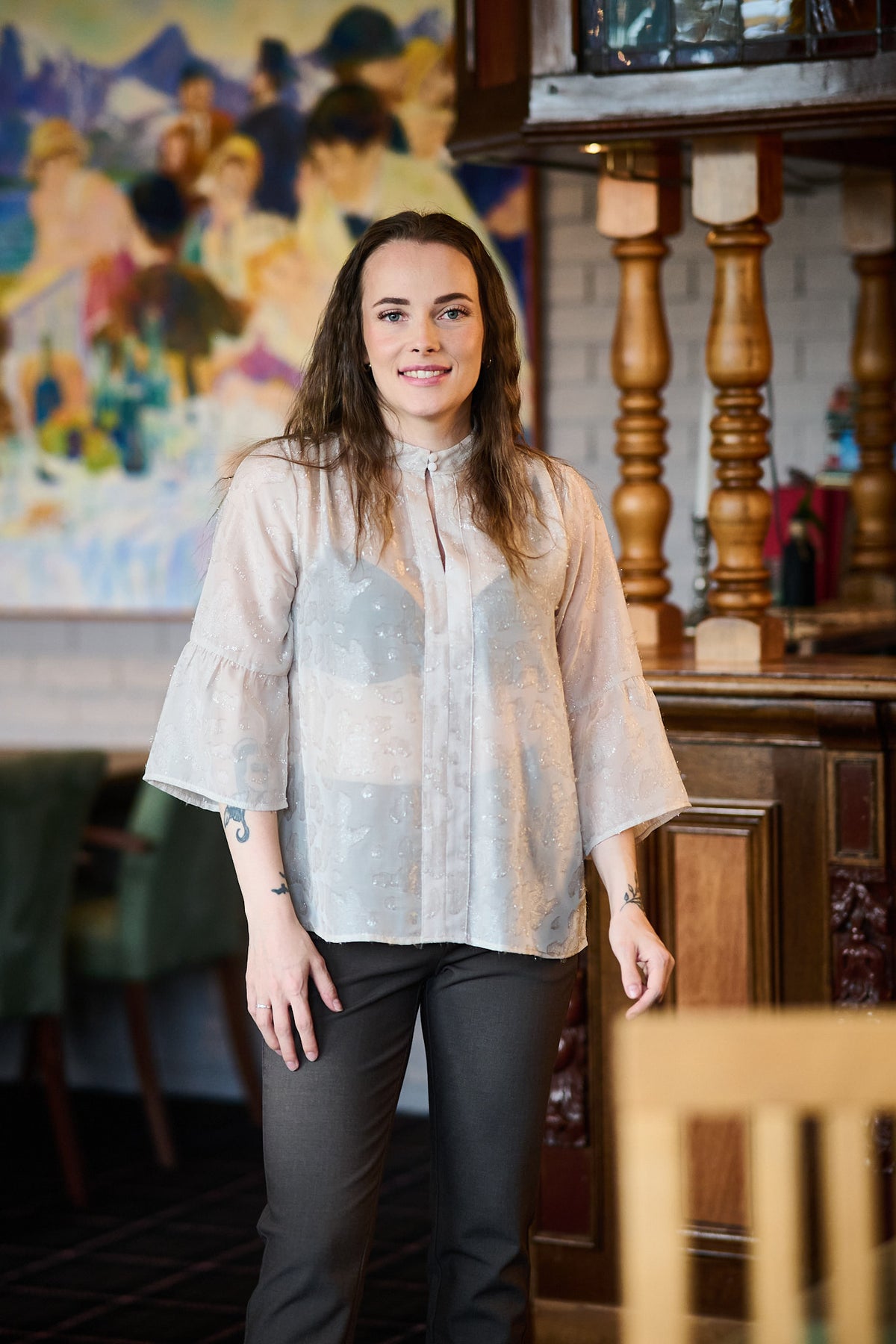 Leveté Room LR-ORION 2 – Light Taupe Combi er den perfekte blusen for deg som ønsker et elegant, moderne og sofistikert uttrykk – feminin, lett og med vakre detaljer. Blusen har et subtilt print, ståkrage med knappelukking i nakken og elegante klokkeermer som gir et eksklusivt preg. Den lette kvaliteten i 100 % polyester gjør den behagelig å ha på og enkel å style både til hverdags og mer formelle anledninger – like fin til jeans som til dressbukse.