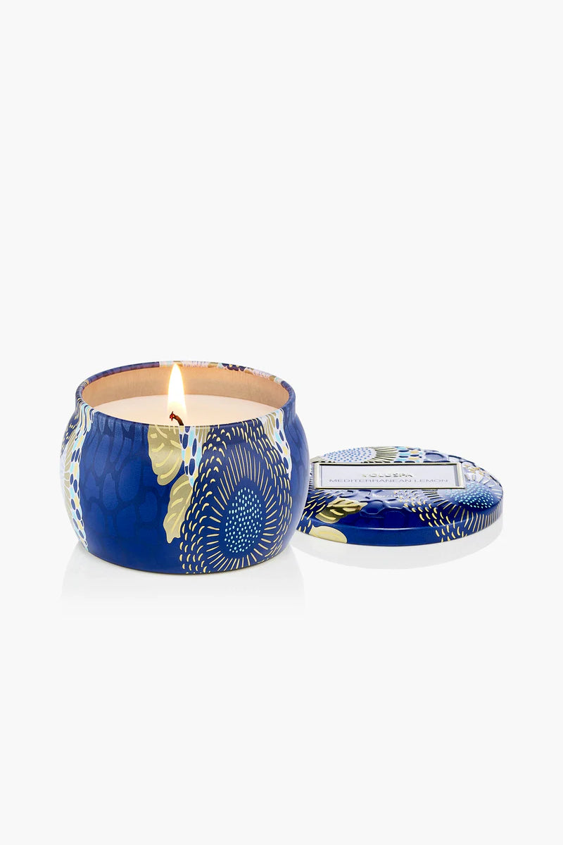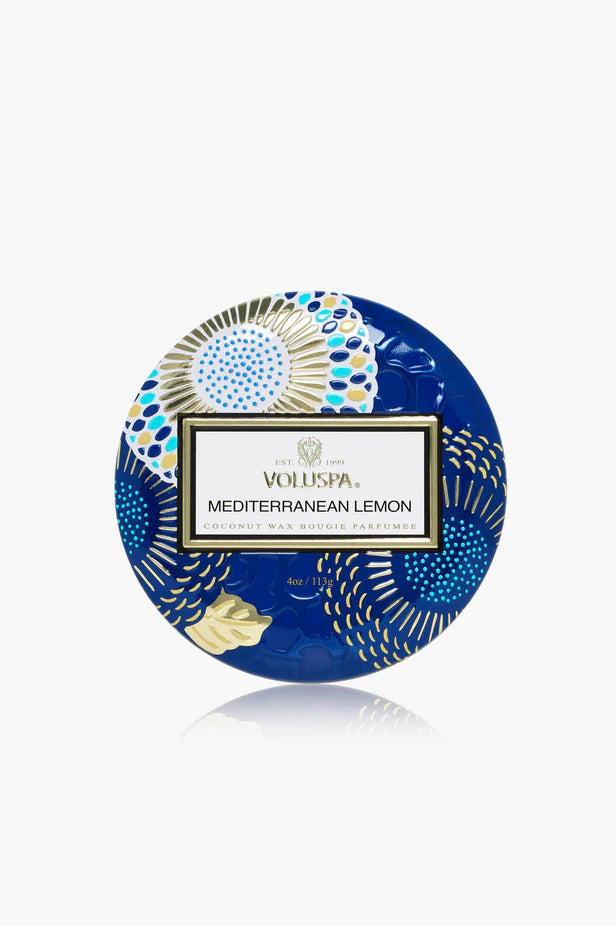 Liten og stemningsfull duftlys-klassiker med frisk, sitrusinspirert aroma fra Voluspa. Dette Mini Tin Candle-lyset har en herlig kombinasjon av siciliansk sitron, bergamot, jasmin og solvarm solar amber som skaper en livlig og solfylt duftopplevelse inspirert av den italienske middelhavskysten.