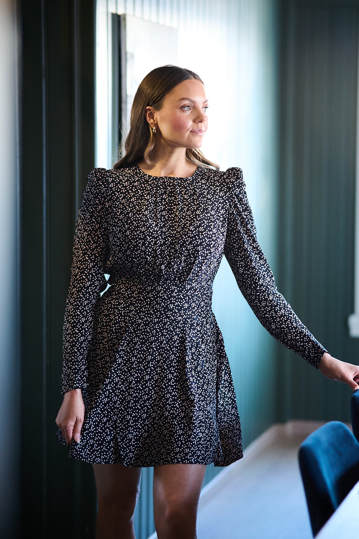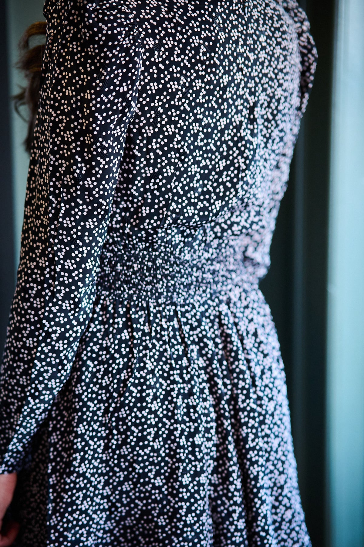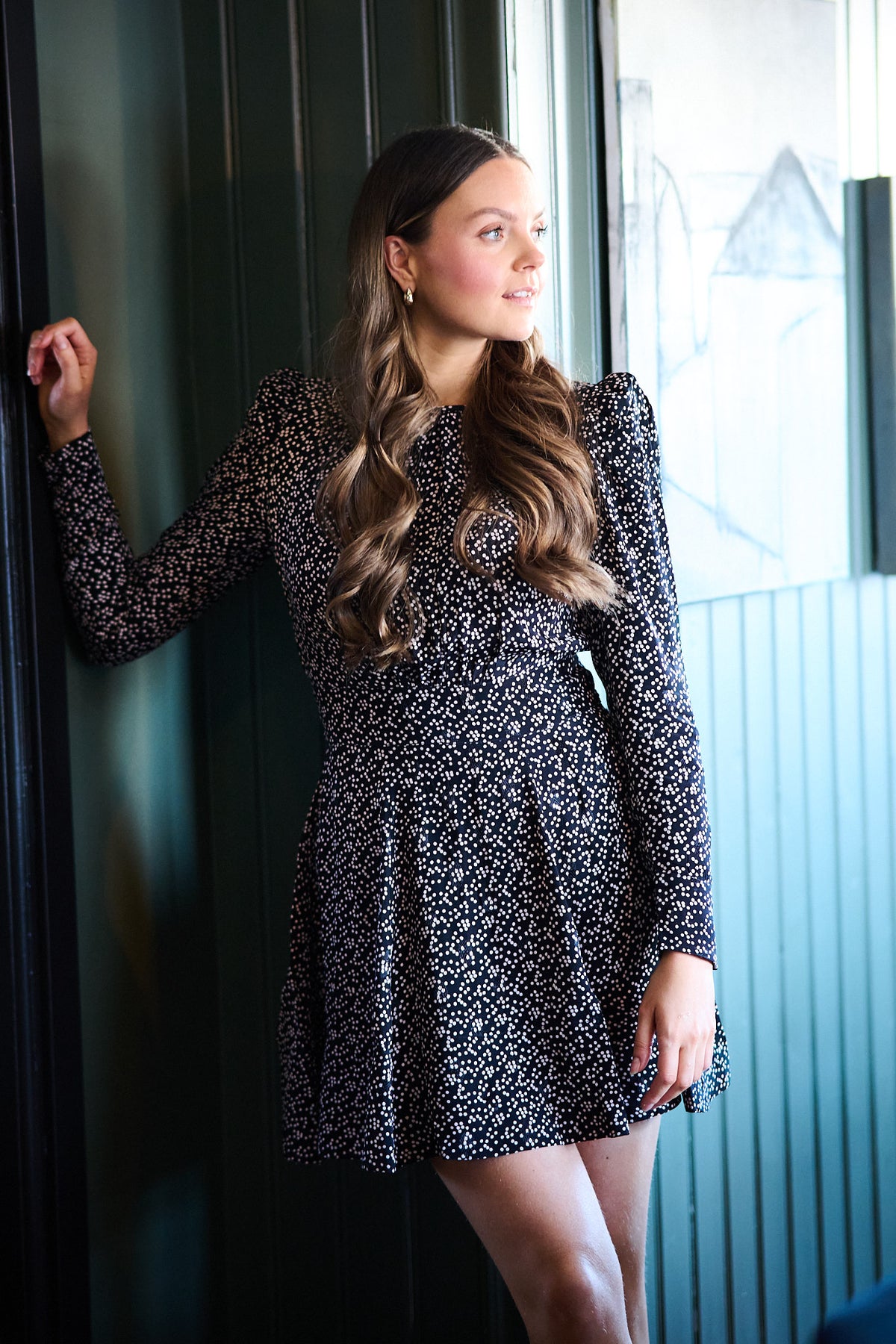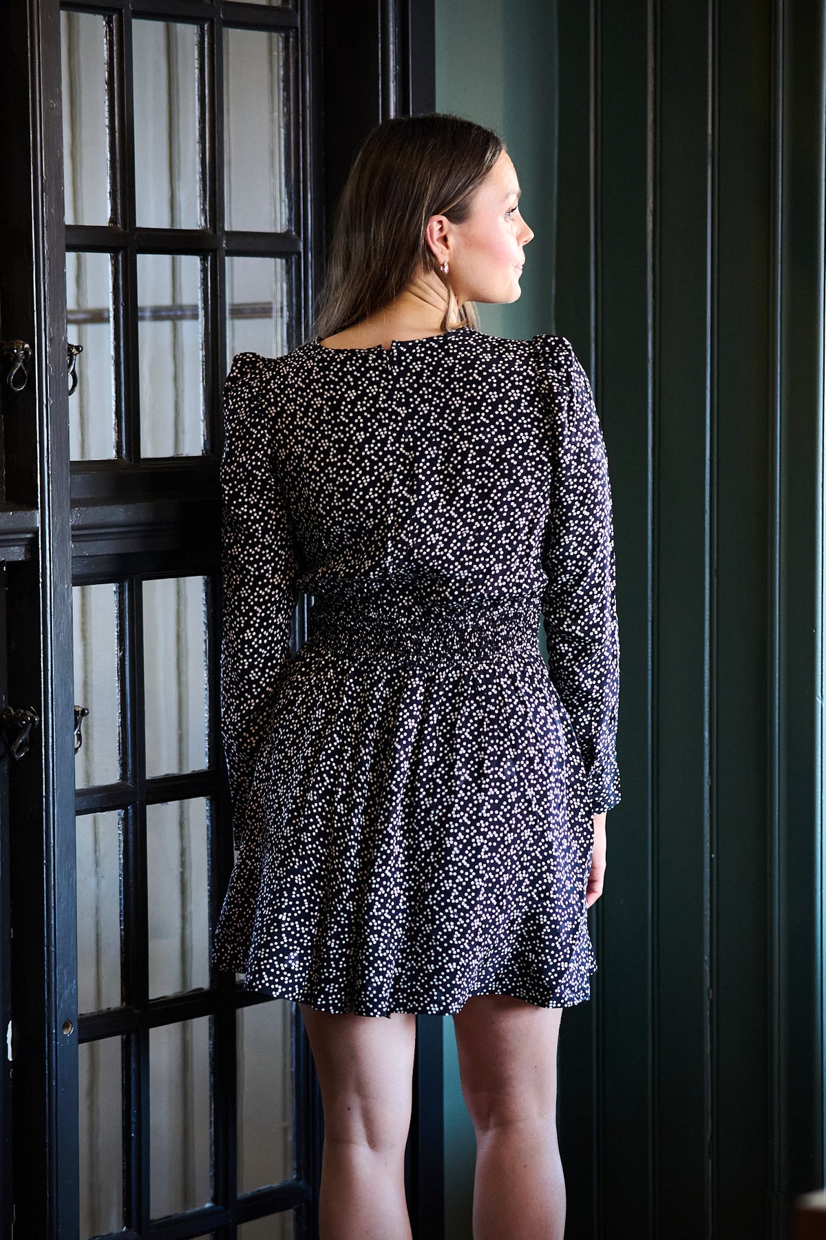 byTiMo Spring Mini Dress – Black Dots er en feminin og leken minikjole med klassiske dots. Den lette kvaliteten og den korte lengden gir et friskt og moderne uttrykk, perfekt til både hverdags og sommerlige anledninger.