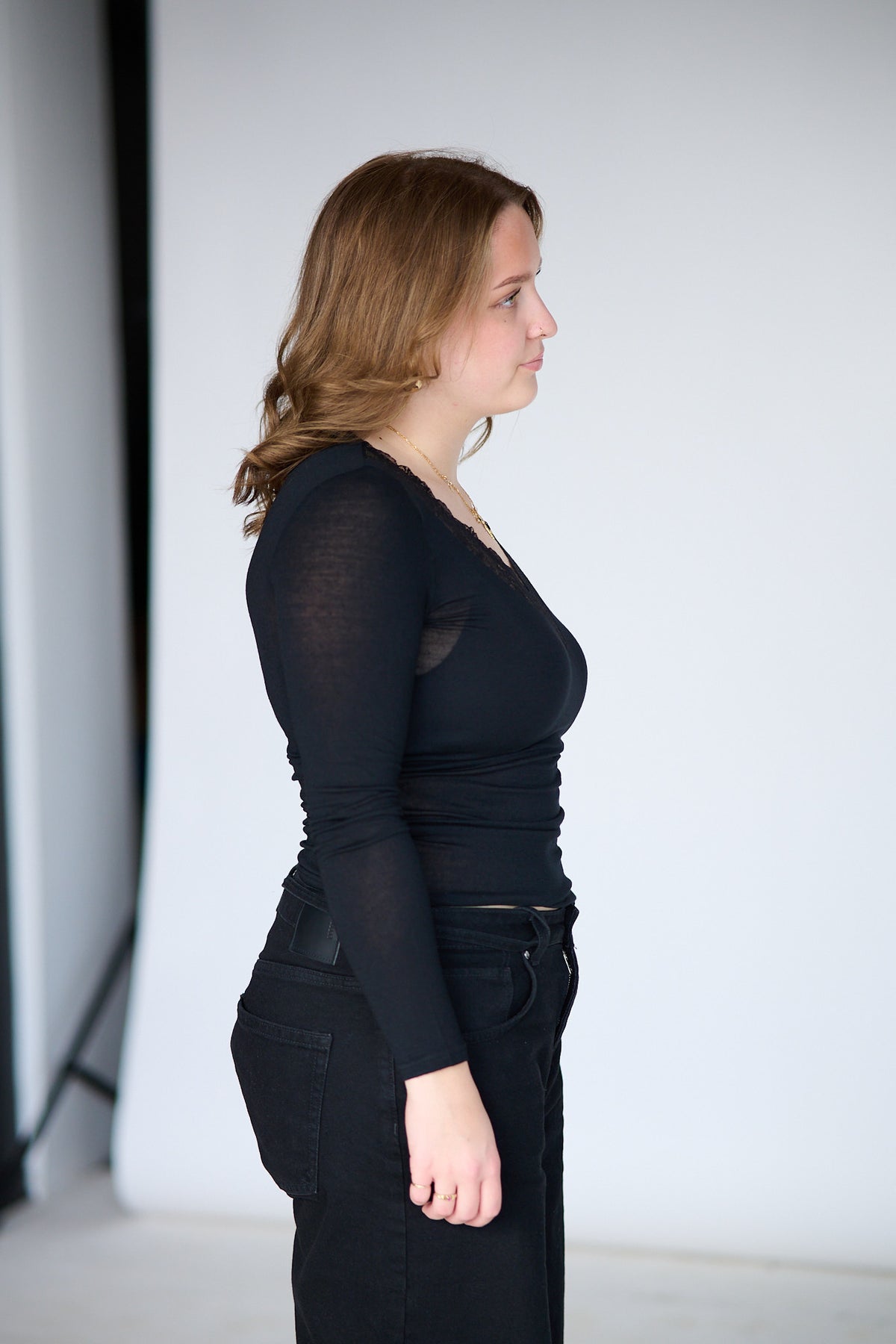 Oroblù Perfect Line Cashmere T-Shirt Long Sleeve Lace er den perfekte langermede basetoppen for deg som ønsker en eksklusiv og feminin garderobefavoritt – elegant, komfortabel og tidløs. Den fine blonden ved ermer og rygg gir et sofistikert preg, mens blandingen av modal, cashmere og elastan gir en myk og luksuriøs følelse med perfekt stretch. En raffinert hverdags- eller festfavoritt som kan brukes alene eller som et ekstra lag under jakker og blazere – et plagg du vil bruke igjen og igjen.
