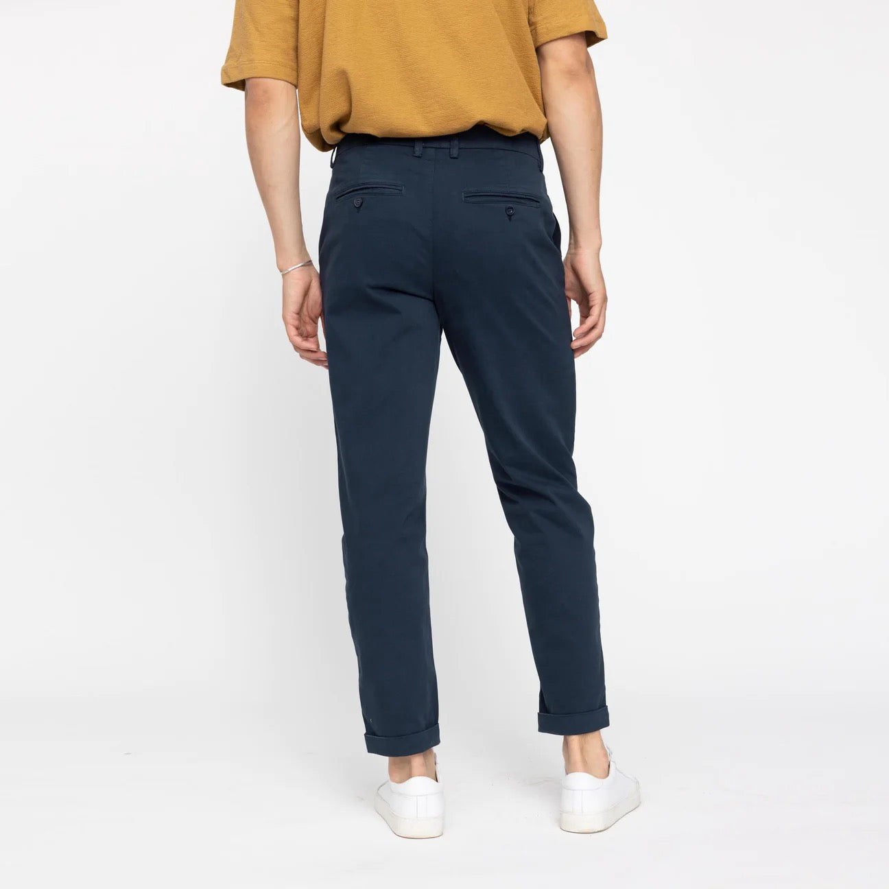 'Albert' er klassiske bukser med konisk passform du kan ha på deg hele dagen, komfortabelt – på din egen måte. Disse er laget av skarp marineblå bomullstwill i et uformelt utseende. Komplett med to skrå frontlommer, to doble paspolerte baklommer, belteløkker, knappelukking og glidelåsgylf. De oppbrettede faldene understreker deres arveuttrykk og varige stil.