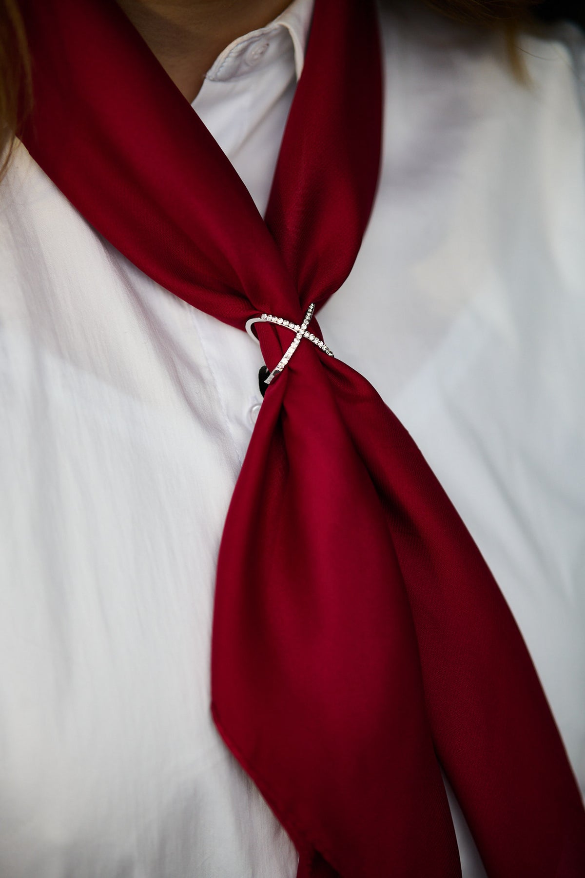 - Brukstips: Tre skjerfet gjennom ringen og la strassene ligge synlig som en dekorativ detalj