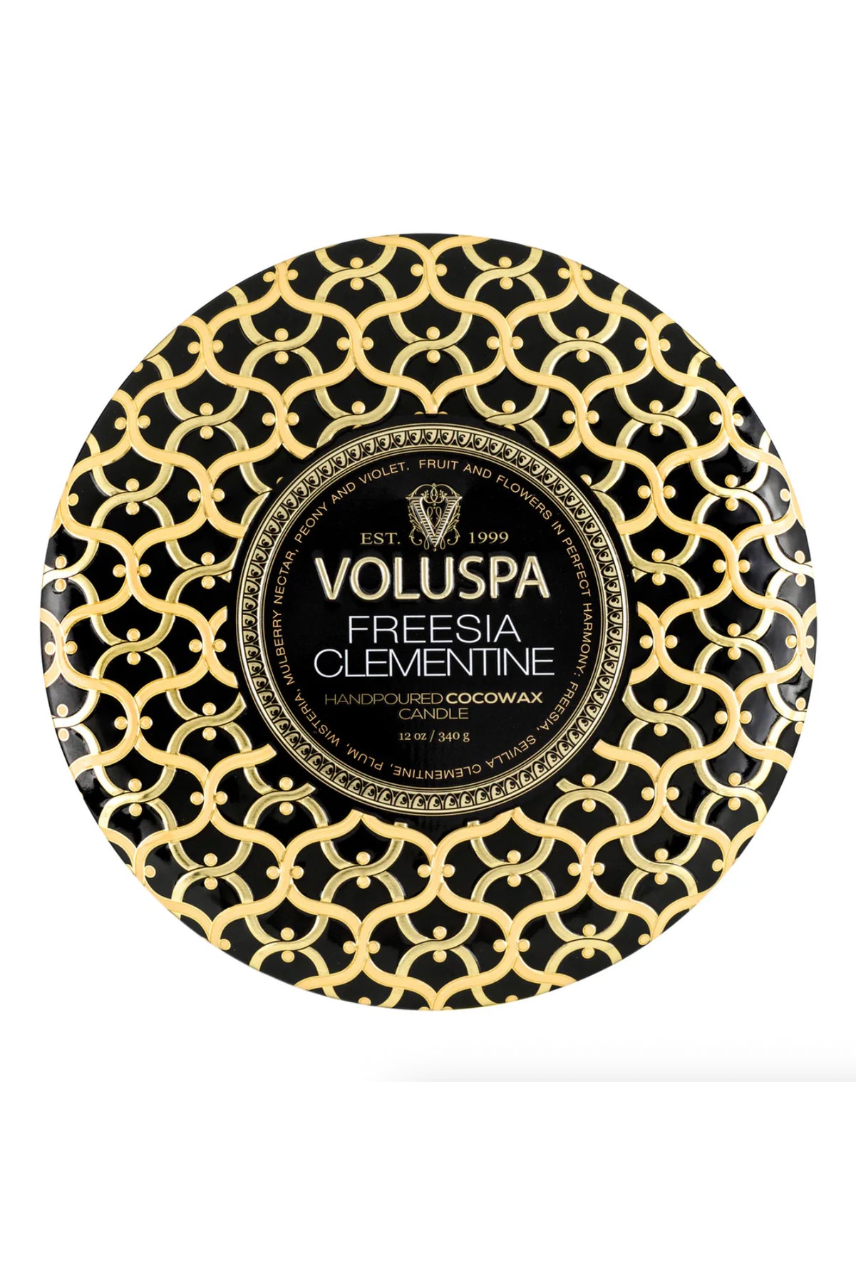 Freesia Clementine 3-Wick Candle dufter av klementiner, nektar og plommer. En sammensetning av frukter og blomster. Rike fargetoner pryder denne vakre tinnboksen.